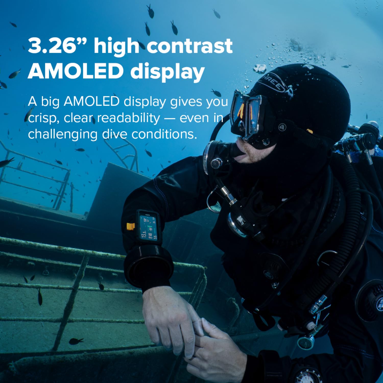 - The bright, high-contrast AMOLED display offers outstanding readability in all conditions, while the compact, leakproof construction, integrated flashlight, and glove-optimized buttons ensure comfort and confidence throughout every dive